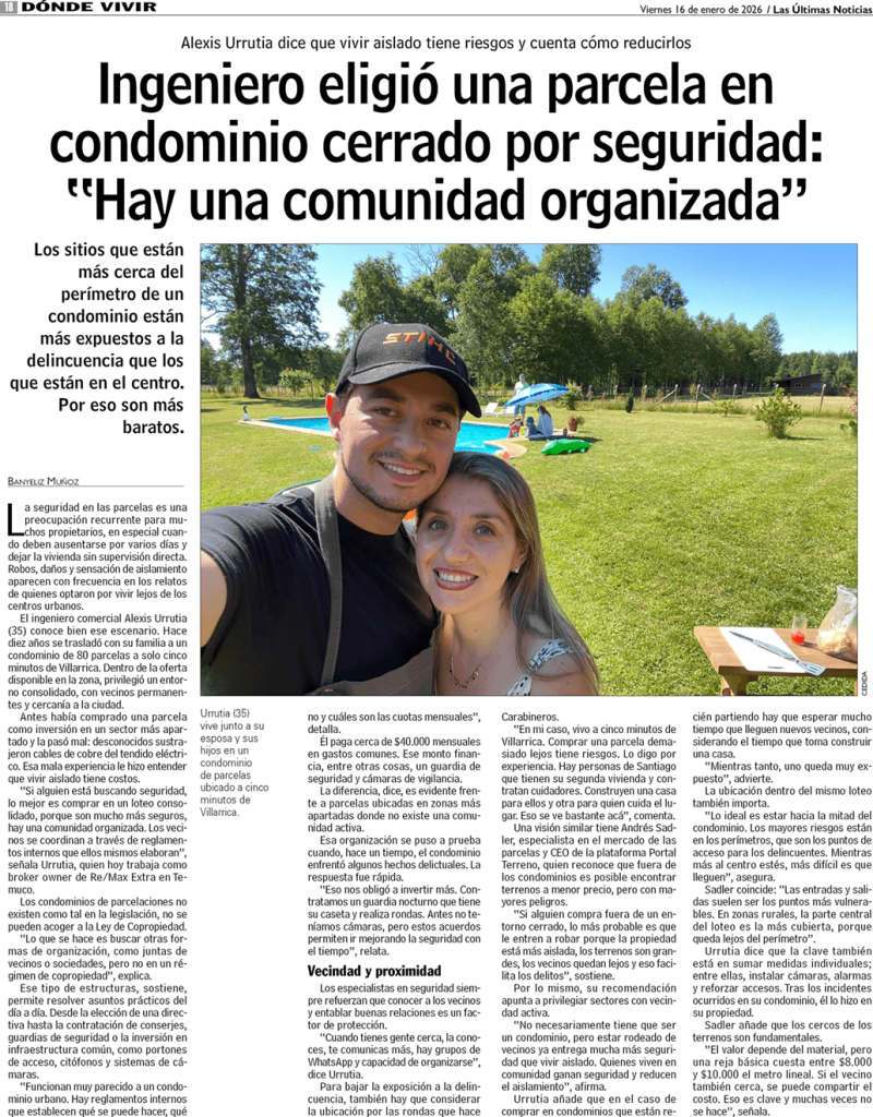 - “Ingeniero eligió una parcela en condominio cerrado por seguridad: “Hay una comunidad organizada“, publicado por Banyeliz Muñoz en diario Las Últimas Noticias el 16 de enero de 2026.